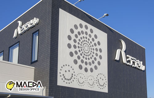 東北労働金庫大曲支店様新店舗の壁面と正面ガラス面に描いた花火のイラストのデザインを担当しました。