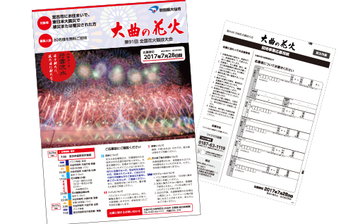 岩手県宮古市、大槌町、宮城県気仙沼市、南三陸町にお住いで東日本大震災で被災または罹災された方を大曲の花火に招待する事業の周知チラシ・応募用紙のデザインを担当しました。