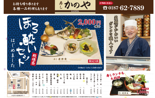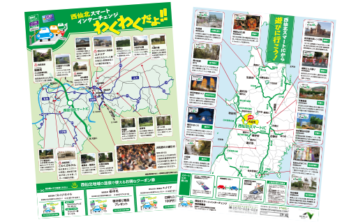西仙北スマートインターチェンジを中心に西仙北地域と東北の観光地を紹介する温泉施設のクーポン券付きのチラシです。デザインと一部の写真を提供しています。